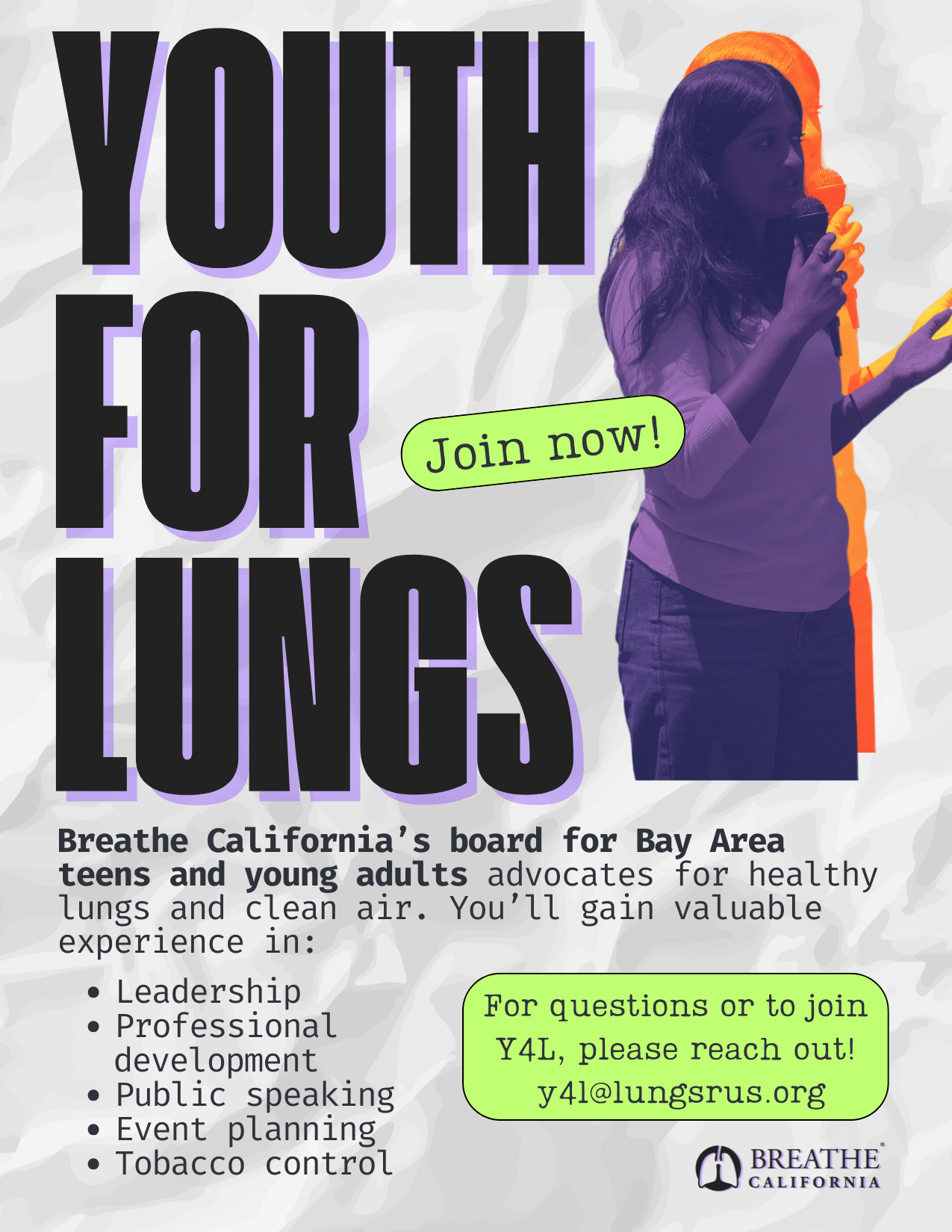 Our youth advocacy group, Youth for Lungs, provides peer support and guidance for any teen or young adult who wants to quit or get involved with promoting lung health in our communities. Download a Y4L flyer. To connect with Youth for Lungs, please email y4l@lungsrus.org.
