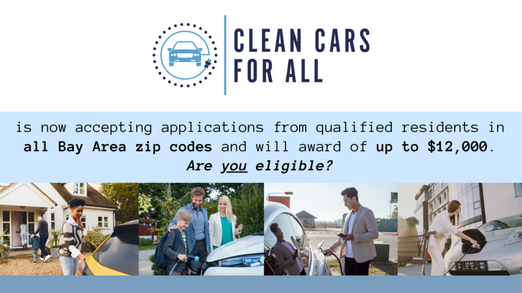 Clean Cars for All is accepting applications for residents that live in all counties in the Bay Area Air Quality Management District’s jurisdiction. Find out if you are eligible on the Eligibility Page. Grants for up to $12,000 are available for income-qualified Bay Area residents to retire their older car and replace it with a hybrid, plug-in hybrid, battery, or hydrogen fuel cell electric vehicle, or a pre-paid card to use for public transit and purchase e-bikes. Learn more about this program today!