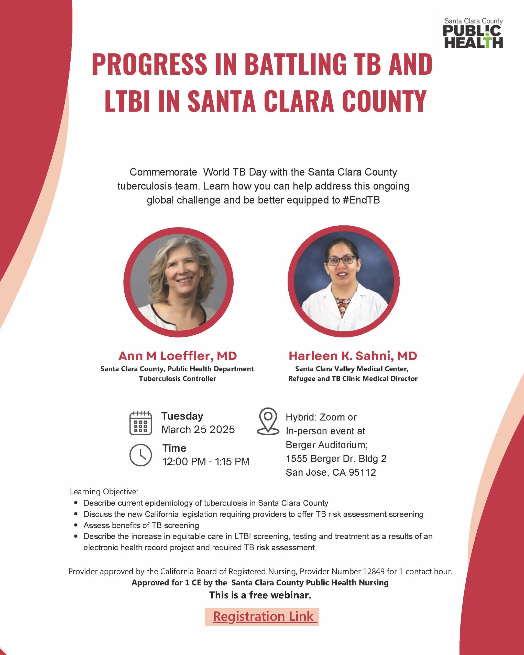 Whether you attend in person or virtually, this event is an excellent opportunity to engage with professionals and community members working together to raise awareness and drive action against TB. Don’t miss out on this critical conversation! Please register here to let us know if you’ll be joining in person or via Zoom. The in-person address is Berger Auditorium, 1555 Berger Dr, San Jose, CA 95112, Bldg. 2.